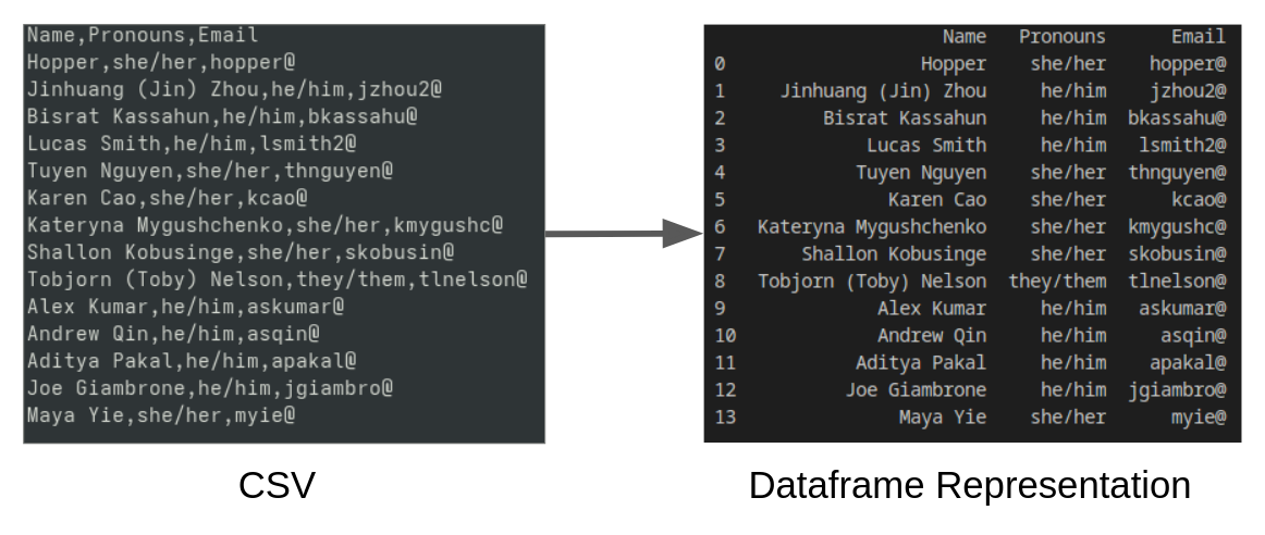 It is helpful to understand the contents of a CSV file by looking at one. Below, is an image of what a CSV file containing the information of CS1-25fa TAs looks like.
