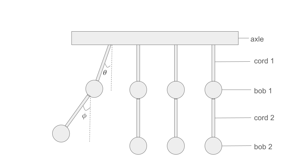 If you’re still reading this, you have implemented the most basic version of the Newton’s cradle: a series of pendulums that collide with each other. However, we can add more degrees of freedom to the system to make it a little more complicated. For instance, we can make each element of the cradle a double pendulum, such that the first pendulum (cord1 and bob1) starts oscillating with angle theta and the second pendulum attached to it (cord2 and bob2) starts oscillating with angle phi.