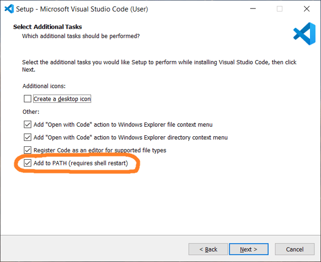 Select Additional Tasksscreen, check the box forAdd to PATH (requires shell restart).